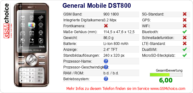 Hast du eigene Webseite? Willst du die Informationen über Standarddaten des Handys General Mobile DST800 irgendwo veröffentlichen? Das ist sehr einfach. Du kannst das Bild herunterladen oder kopieren und auf der Webseite folgenden Code hinzufügen:Das Einfügen von diesem Code verursacht das Anzeigen von dem folgenden Bild: