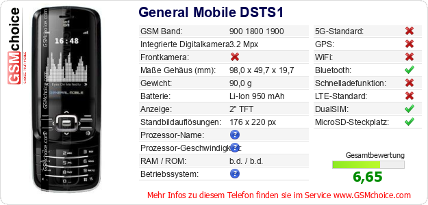 Hast du eigene Webseite? Willst du die Informationen über Standarddaten des Handys General Mobile DSTS1 irgendwo veröffentlichen? Das ist sehr einfach. Du kannst das Bild herunterladen oder kopieren und auf der Webseite folgenden Code hinzufügen:Das Einfügen von diesem Code verursacht das Anzeigen von dem folgenden Bild: