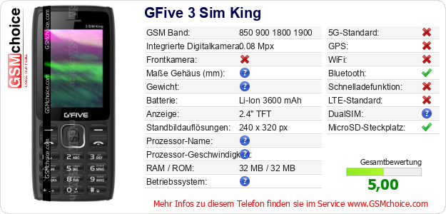 Daten des Mobiltelefons GFive 3 Sim King auf Ihrer Seite