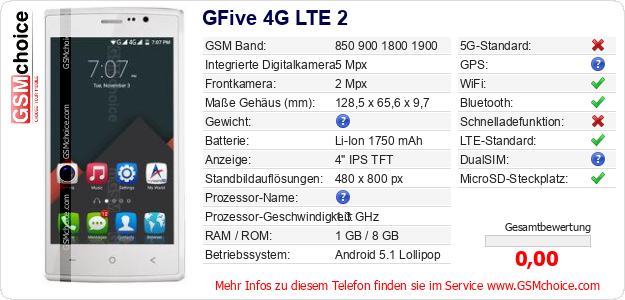 Hast du eigene Webseite? Willst du die Informationen über Standarddaten des Handys GFive 4G LTE 2 irgendwo veröffentlichen? Das ist sehr einfach. Du kannst das Bild herunterladen oder kopieren und auf der Webseite folgenden Code hinzufügen:Das Einfügen von diesem Code verursacht das Anzeigen von dem folgenden Bild: