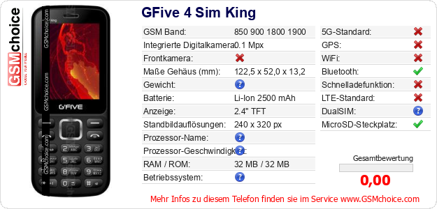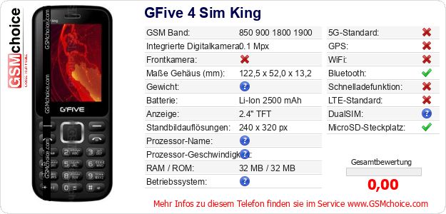 Daten des Mobiltelefons GFive 4 Sim King auf Ihrer Seite