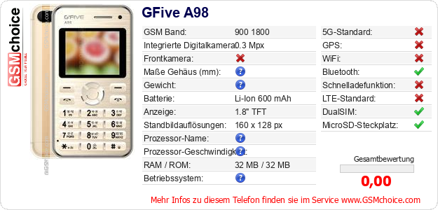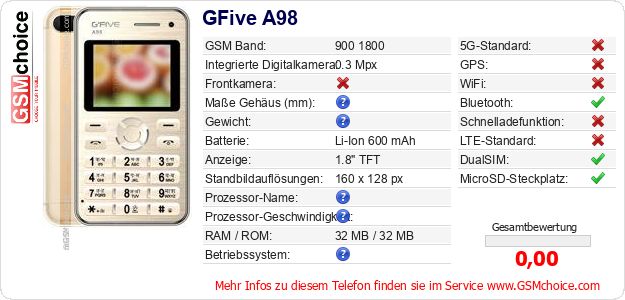 Hast du eigene Webseite? Willst du die Informationen über Standarddaten des Handys GFive A98 irgendwo veröffentlichen? Das ist sehr einfach. Du kannst das Bild herunterladen oder kopieren und auf der Webseite folgenden Code hinzufügen:Das Einfügen von diesem Code verursacht das Anzeigen von dem folgenden Bild: