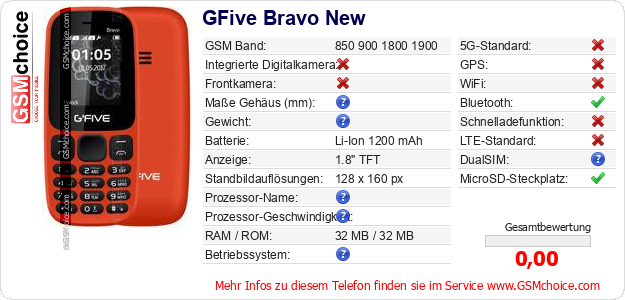 Hast du eigene Webseite? Willst du die Informationen über Standarddaten des Handys GFive Bravo New irgendwo veröffentlichen? Das ist sehr einfach. Du kannst das Bild herunterladen oder kopieren und auf der Webseite folgenden Code hinzufügen:Das Einfügen von diesem Code verursacht das Anzeigen von dem folgenden Bild: