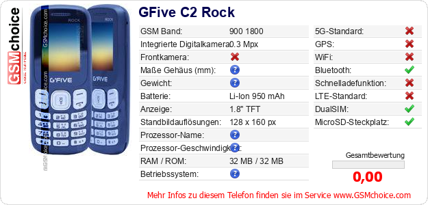 Hast du eigene Webseite? Willst du die Informationen über Standarddaten des Handys GFive C2 Rock irgendwo veröffentlichen? Das ist sehr einfach. Du kannst das Bild herunterladen oder kopieren und auf der Webseite folgenden Code hinzufügen:Das Einfügen von diesem Code verursacht das Anzeigen von dem folgenden Bild: