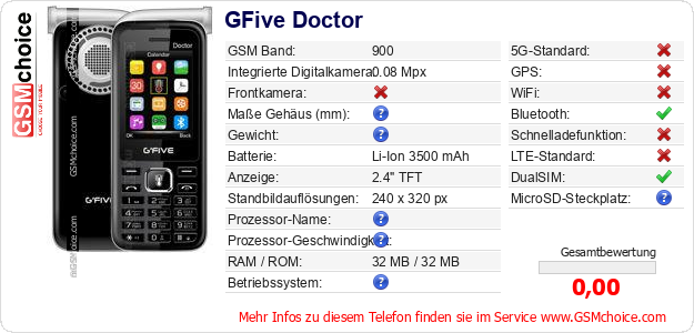 Hast du eigene Webseite? Willst du die Informationen über Standarddaten des Handys GFive Doctor irgendwo veröffentlichen? Das ist sehr einfach. Du kannst das Bild herunterladen oder kopieren und auf der Webseite folgenden Code hinzufügen:Das Einfügen von diesem Code verursacht das Anzeigen von dem folgenden Bild: