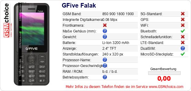 Hast du eigene Webseite? Willst du die Informationen über Standarddaten des Handys GFive Falak irgendwo veröffentlichen? Das ist sehr einfach. Du kannst das Bild herunterladen oder kopieren und auf der Webseite folgenden Code hinzufügen:Das Einfügen von diesem Code verursacht das Anzeigen von dem folgenden Bild: