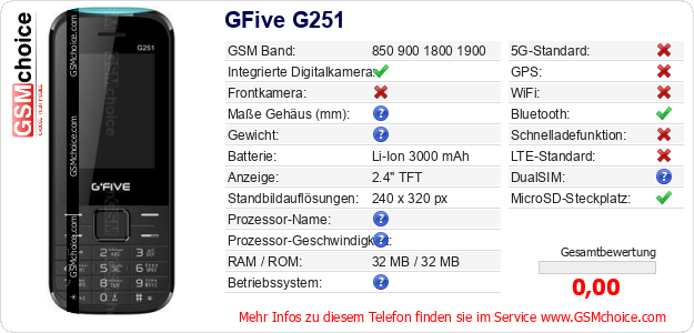 Hast du eigene Webseite? Willst du die Informationen über Standarddaten des Handys GFive G251 irgendwo veröffentlichen? Das ist sehr einfach. Du kannst das Bild herunterladen oder kopieren und auf der Webseite folgenden Code hinzufügen:Das Einfügen von diesem Code verursacht das Anzeigen von dem folgenden Bild: