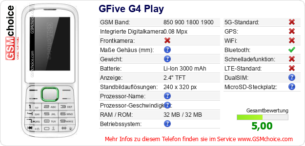 Hast du eigene Webseite? Willst du die Informationen über Standarddaten des Handys GFive G4 Play irgendwo veröffentlichen? Das ist sehr einfach. Du kannst das Bild herunterladen oder kopieren und auf der Webseite folgenden Code hinzufügen:Das Einfügen von diesem Code verursacht das Anzeigen von dem folgenden Bild: