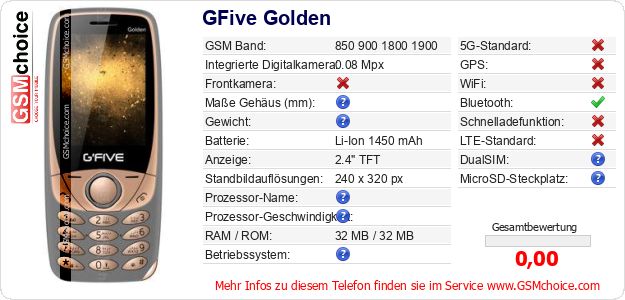 Hast du eigene Webseite? Willst du die Informationen über Standarddaten des Handys GFive Golden irgendwo veröffentlichen? Das ist sehr einfach. Du kannst das Bild herunterladen oder kopieren und auf der Webseite folgenden Code hinzufügen:Das Einfügen von diesem Code verursacht das Anzeigen von dem folgenden Bild: