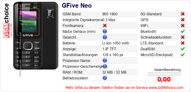 Hast du eigene Webseite? Willst du die Informationen über Standarddaten des Handys GFive Neo irgendwo veröffentlichen? Das ist sehr einfach. Du kannst das Bild herunterladen oder kopieren und auf der Webseite folgenden Code hinzufügen:Das Einfügen von diesem Code verursacht das Anzeigen von dem folgenden Bild: