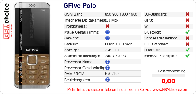 Hast du eigene Webseite? Willst du die Informationen über Standarddaten des Handys GFive Polo irgendwo veröffentlichen? Das ist sehr einfach. Du kannst das Bild herunterladen oder kopieren und auf der Webseite folgenden Code hinzufügen:Das Einfügen von diesem Code verursacht das Anzeigen von dem folgenden Bild: