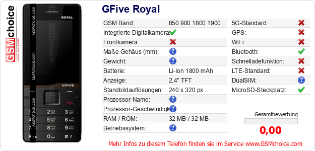 Hast du eigene Webseite? Willst du die Informationen über Standarddaten des Handys GFive Royal irgendwo veröffentlichen? Das ist sehr einfach. Du kannst das Bild herunterladen oder kopieren und auf der Webseite folgenden Code hinzufügen:Das Einfügen von diesem Code verursacht das Anzeigen von dem folgenden Bild: