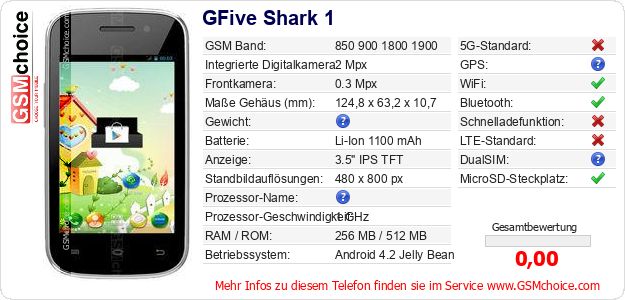 Hast du eigene Webseite? Willst du die Informationen über Standarddaten des Handys GFive Shark 1 irgendwo veröffentlichen? Das ist sehr einfach. Du kannst das Bild herunterladen oder kopieren und auf der Webseite folgenden Code hinzufügen:Das Einfügen von diesem Code verursacht das Anzeigen von dem folgenden Bild: