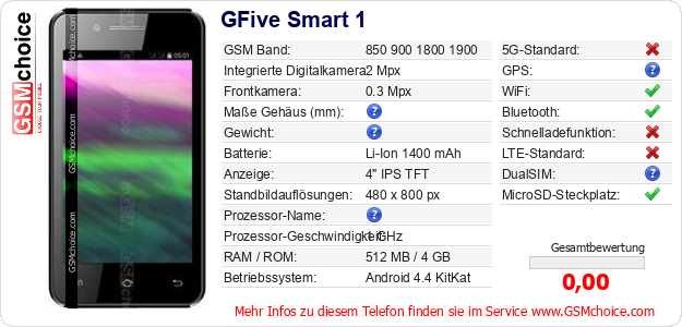 Hast du eigene Webseite? Willst du die Informationen über Standarddaten des Handys GFive Smart 1 irgendwo veröffentlichen? Das ist sehr einfach. Du kannst das Bild herunterladen oder kopieren und auf der Webseite folgenden Code hinzufügen:Das Einfügen von diesem Code verursacht das Anzeigen von dem folgenden Bild: