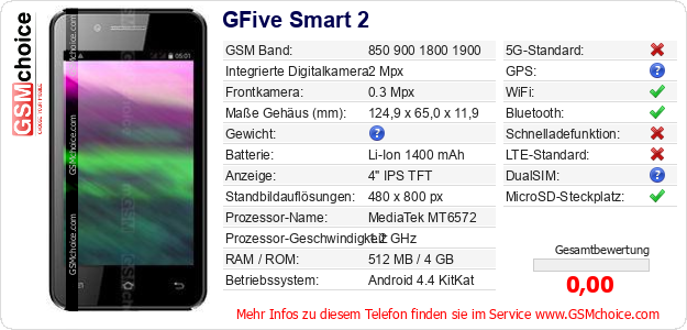 Hast du eigene Webseite? Willst du die Informationen über Standarddaten des Handys GFive Smart 2 irgendwo veröffentlichen? Das ist sehr einfach. Du kannst das Bild herunterladen oder kopieren und auf der Webseite folgenden Code hinzufügen:Das Einfügen von diesem Code verursacht das Anzeigen von dem folgenden Bild: