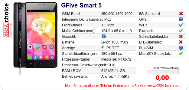 Hast du eigene Webseite? Willst du die Informationen über Standarddaten des Handys GFive Smart 5 irgendwo veröffentlichen? Das ist sehr einfach. Du kannst das Bild herunterladen oder kopieren und auf der Webseite folgenden Code hinzufügen:Das Einfügen von diesem Code verursacht das Anzeigen von dem folgenden Bild: