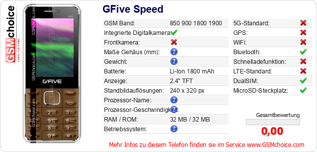 Hast du eigene Webseite? Willst du die Informationen über Standarddaten des Handys GFive Speed irgendwo veröffentlichen? Das ist sehr einfach. Du kannst das Bild herunterladen oder kopieren und auf der Webseite folgenden Code hinzufügen:Das Einfügen von diesem Code verursacht das Anzeigen von dem folgenden Bild: