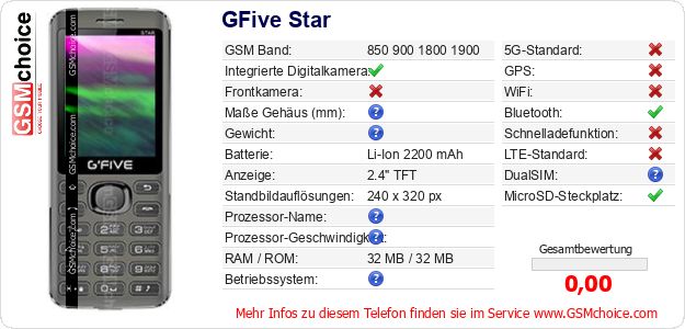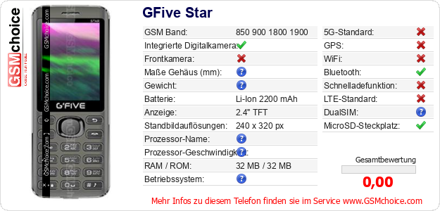 Hast du eigene Webseite? Willst du die Informationen über Standarddaten des Handys GFive Star irgendwo veröffentlichen? Das ist sehr einfach. Du kannst das Bild herunterladen oder kopieren und auf der Webseite folgenden Code hinzufügen:Das Einfügen von diesem Code verursacht das Anzeigen von dem folgenden Bild: