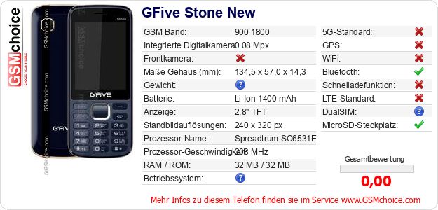 Hast du eigene Webseite? Willst du die Informationen über Standarddaten des Handys GFive Stone New irgendwo veröffentlichen? Das ist sehr einfach. Du kannst das Bild herunterladen oder kopieren und auf der Webseite folgenden Code hinzufügen:Das Einfügen von diesem Code verursacht das Anzeigen von dem folgenden Bild: