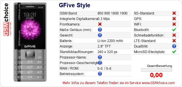 Hast du eigene Webseite? Willst du die Informationen über Standarddaten des Handys GFive Style irgendwo veröffentlichen? Das ist sehr einfach. Du kannst das Bild herunterladen oder kopieren und auf der Webseite folgenden Code hinzufügen:Das Einfügen von diesem Code verursacht das Anzeigen von dem folgenden Bild: