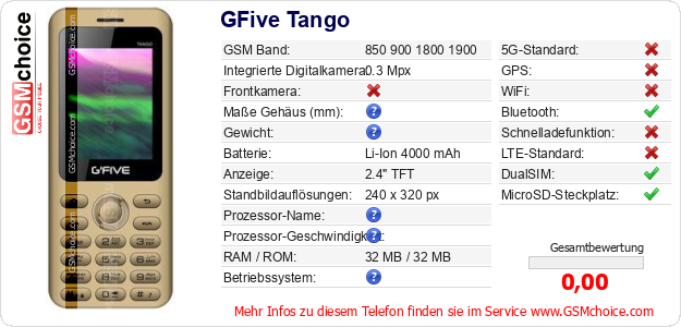 Hast du eigene Webseite? Willst du die Informationen über Standarddaten des Handys GFive Tango irgendwo veröffentlichen? Das ist sehr einfach. Du kannst das Bild herunterladen oder kopieren und auf der Webseite folgenden Code hinzufügen:Das Einfügen von diesem Code verursacht das Anzeigen von dem folgenden Bild: