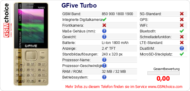 Hast du eigene Webseite? Willst du die Informationen über Standarddaten des Handys GFive Turbo irgendwo veröffentlichen? Das ist sehr einfach. Du kannst das Bild herunterladen oder kopieren und auf der Webseite folgenden Code hinzufügen:Das Einfügen von diesem Code verursacht das Anzeigen von dem folgenden Bild: