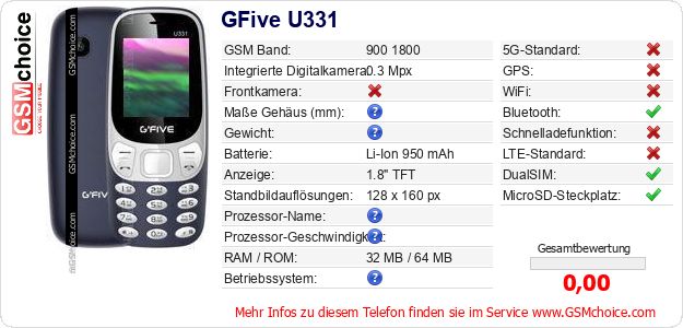Hast du eigene Webseite? Willst du die Informationen über Standarddaten des Handys GFive U331 irgendwo veröffentlichen? Das ist sehr einfach. Du kannst das Bild herunterladen oder kopieren und auf der Webseite folgenden Code hinzufügen:Das Einfügen von diesem Code verursacht das Anzeigen von dem folgenden Bild: