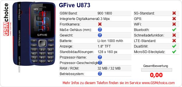 Hast du eigene Webseite? Willst du die Informationen über Standarddaten des Handys GFive U873 irgendwo veröffentlichen? Das ist sehr einfach. Du kannst das Bild herunterladen oder kopieren und auf der Webseite folgenden Code hinzufügen:Das Einfügen von diesem Code verursacht das Anzeigen von dem folgenden Bild:
