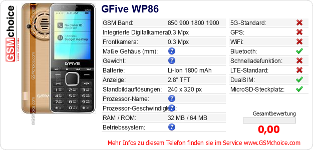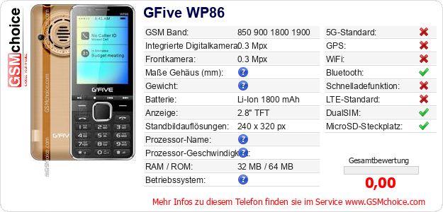Hast du eigene Webseite? Willst du die Informationen über Standarddaten des Handys GFive WP86 irgendwo veröffentlichen? Das ist sehr einfach. Du kannst das Bild herunterladen oder kopieren und auf der Webseite folgenden Code hinzufügen:Das Einfügen von diesem Code verursacht das Anzeigen von dem folgenden Bild: