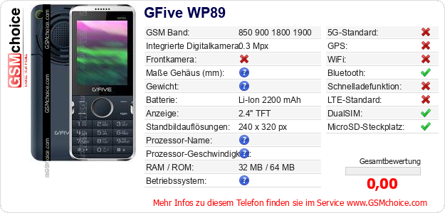 Hast du eigene Webseite? Willst du die Informationen über Standarddaten des Handys GFive WP89 irgendwo veröffentlichen? Das ist sehr einfach. Du kannst das Bild herunterladen oder kopieren und auf der Webseite folgenden Code hinzufügen:Das Einfügen von diesem Code verursacht das Anzeigen von dem folgenden Bild: