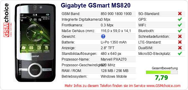Hast du eigene Webseite? Willst du die Informationen über Standarddaten des Handys Gigabyte GSmart MS820 irgendwo veröffentlichen? Das ist sehr einfach. Du kannst das Bild herunterladen oder kopieren und auf der Webseite folgenden Code hinzufügen:Das Einfügen von diesem Code verursacht das Anzeigen von dem folgenden Bild: