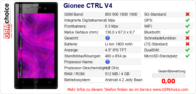 Hast du eigene Webseite? Willst du die Informationen über Standarddaten des Handys Gionee CTRL V4 irgendwo veröffentlichen? Das ist sehr einfach. Du kannst das Bild herunterladen oder kopieren und auf der Webseite folgenden Code hinzufügen:Das Einfügen von diesem Code verursacht das Anzeigen von dem folgenden Bild: