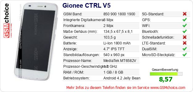 Hast du eigene Webseite? Willst du die Informationen über Standarddaten des Handys Gionee CTRL V5 irgendwo veröffentlichen? Das ist sehr einfach. Du kannst das Bild herunterladen oder kopieren und auf der Webseite folgenden Code hinzufügen:Das Einfügen von diesem Code verursacht das Anzeigen von dem folgenden Bild: