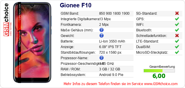 Hast du eigene Webseite? Willst du die Informationen über Standarddaten des Handys Gionee F10 irgendwo veröffentlichen? Das ist sehr einfach. Du kannst das Bild herunterladen oder kopieren und auf der Webseite folgenden Code hinzufügen:Das Einfügen von diesem Code verursacht das Anzeigen von dem folgenden Bild: