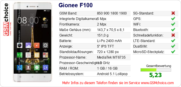 Hast du eigene Webseite? Willst du die Informationen über Standarddaten des Handys Gionee F100 irgendwo veröffentlichen? Das ist sehr einfach. Du kannst das Bild herunterladen oder kopieren und auf der Webseite folgenden Code hinzufügen:Das Einfügen von diesem Code verursacht das Anzeigen von dem folgenden Bild:
