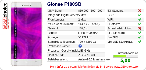 Hast du eigene Webseite? Willst du die Informationen über Standarddaten des Handys Gionee F100SD irgendwo veröffentlichen? Das ist sehr einfach. Du kannst das Bild herunterladen oder kopieren und auf der Webseite folgenden Code hinzufügen:Das Einfügen von diesem Code verursacht das Anzeigen von dem folgenden Bild: