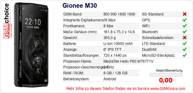 Hast du eigene Webseite? Willst du die Informationen über Standarddaten des Handys Gionee M30 irgendwo veröffentlichen? Das ist sehr einfach. Du kannst das Bild herunterladen oder kopieren und auf der Webseite folgenden Code hinzufügen:Das Einfügen von diesem Code verursacht das Anzeigen von dem folgenden Bild: