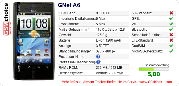 Hast du eigene Webseite? Willst du die Informationen über Standarddaten des Handys GNet A6 irgendwo veröffentlichen? Das ist sehr einfach. Du kannst das Bild herunterladen oder kopieren und auf der Webseite folgenden Code hinzufügen:Das Einfügen von diesem Code verursacht das Anzeigen von dem folgenden Bild: