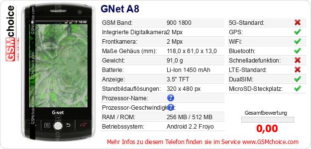 Hast du eigene Webseite? Willst du die Informationen über Standarddaten des Handys GNet A8 irgendwo veröffentlichen? Das ist sehr einfach. Du kannst das Bild herunterladen oder kopieren und auf der Webseite folgenden Code hinzufügen:Das Einfügen von diesem Code verursacht das Anzeigen von dem folgenden Bild: