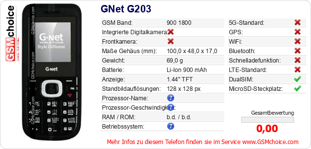 Hast du eigene Webseite? Willst du die Informationen über Standarddaten des Handys GNet G203 irgendwo veröffentlichen? Das ist sehr einfach. Du kannst das Bild herunterladen oder kopieren und auf der Webseite folgenden Code hinzufügen:Das Einfügen von diesem Code verursacht das Anzeigen von dem folgenden Bild: