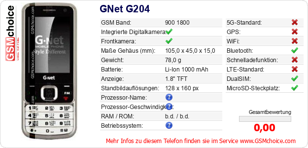 Hast du eigene Webseite? Willst du die Informationen über Standarddaten des Handys GNet G204 irgendwo veröffentlichen? Das ist sehr einfach. Du kannst das Bild herunterladen oder kopieren und auf der Webseite folgenden Code hinzufügen:Das Einfügen von diesem Code verursacht das Anzeigen von dem folgenden Bild: