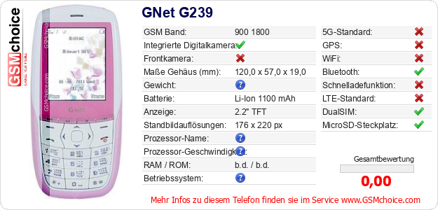 Hast du eigene Webseite? Willst du die Informationen über Standarddaten des Handys GNet G239 irgendwo veröffentlichen? Das ist sehr einfach. Du kannst das Bild herunterladen oder kopieren und auf der Webseite folgenden Code hinzufügen:Das Einfügen von diesem Code verursacht das Anzeigen von dem folgenden Bild: