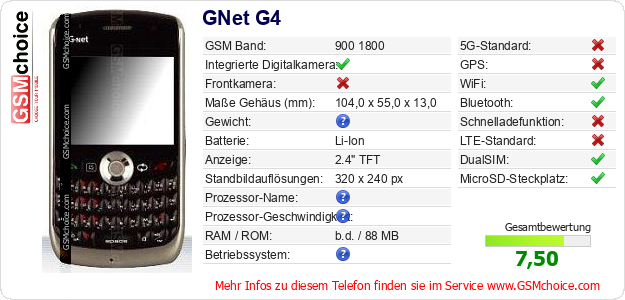 Hast du eigene Webseite? Willst du die Informationen über Standarddaten des Handys GNet G4 irgendwo veröffentlichen? Das ist sehr einfach. Du kannst das Bild herunterladen oder kopieren und auf der Webseite folgenden Code hinzufügen:Das Einfügen von diesem Code verursacht das Anzeigen von dem folgenden Bild: