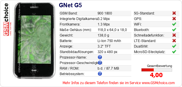 Hast du eigene Webseite? Willst du die Informationen über Standarddaten des Handys GNet G5 irgendwo veröffentlichen? Das ist sehr einfach. Du kannst das Bild herunterladen oder kopieren und auf der Webseite folgenden Code hinzufügen:Das Einfügen von diesem Code verursacht das Anzeigen von dem folgenden Bild: