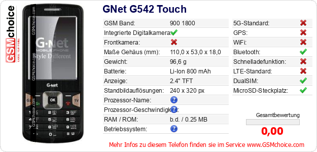Hast du eigene Webseite? Willst du die Informationen über Standarddaten des Handys GNet G542 Touch irgendwo veröffentlichen? Das ist sehr einfach. Du kannst das Bild herunterladen oder kopieren und auf der Webseite folgenden Code hinzufügen:Das Einfügen von diesem Code verursacht das Anzeigen von dem folgenden Bild: