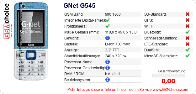 Hast du eigene Webseite? Willst du die Informationen über Standarddaten des Handys GNet G545 irgendwo veröffentlichen? Das ist sehr einfach. Du kannst das Bild herunterladen oder kopieren und auf der Webseite folgenden Code hinzufügen:Das Einfügen von diesem Code verursacht das Anzeigen von dem folgenden Bild:
