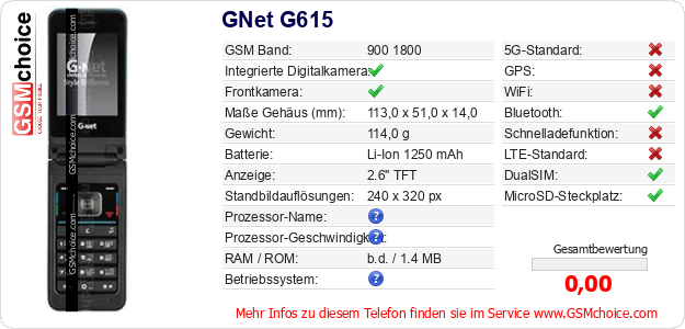 Hast du eigene Webseite? Willst du die Informationen über Standarddaten des Handys GNet G615 irgendwo veröffentlichen? Das ist sehr einfach. Du kannst das Bild herunterladen oder kopieren und auf der Webseite folgenden Code hinzufügen:Das Einfügen von diesem Code verursacht das Anzeigen von dem folgenden Bild: