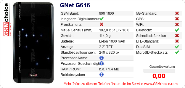 Hast du eigene Webseite? Willst du die Informationen über Standarddaten des Handys GNet G616 irgendwo veröffentlichen? Das ist sehr einfach. Du kannst das Bild herunterladen oder kopieren und auf der Webseite folgenden Code hinzufügen:Das Einfügen von diesem Code verursacht das Anzeigen von dem folgenden Bild: