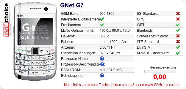 Hast du eigene Webseite? Willst du die Informationen über Standarddaten des Handys GNet G7 irgendwo veröffentlichen? Das ist sehr einfach. Du kannst das Bild herunterladen oder kopieren und auf der Webseite folgenden Code hinzufügen:Das Einfügen von diesem Code verursacht das Anzeigen von dem folgenden Bild: