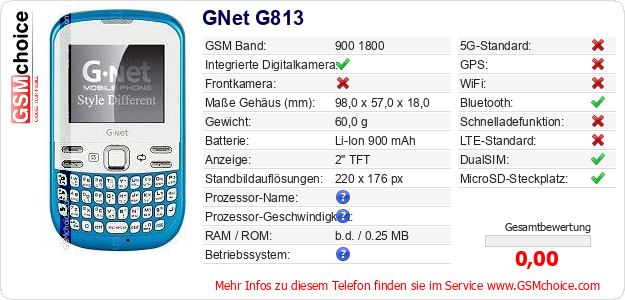 Hast du eigene Webseite? Willst du die Informationen über Standarddaten des Handys GNet G813 irgendwo veröffentlichen? Das ist sehr einfach. Du kannst das Bild herunterladen oder kopieren und auf der Webseite folgenden Code hinzufügen:Das Einfügen von diesem Code verursacht das Anzeigen von dem folgenden Bild: